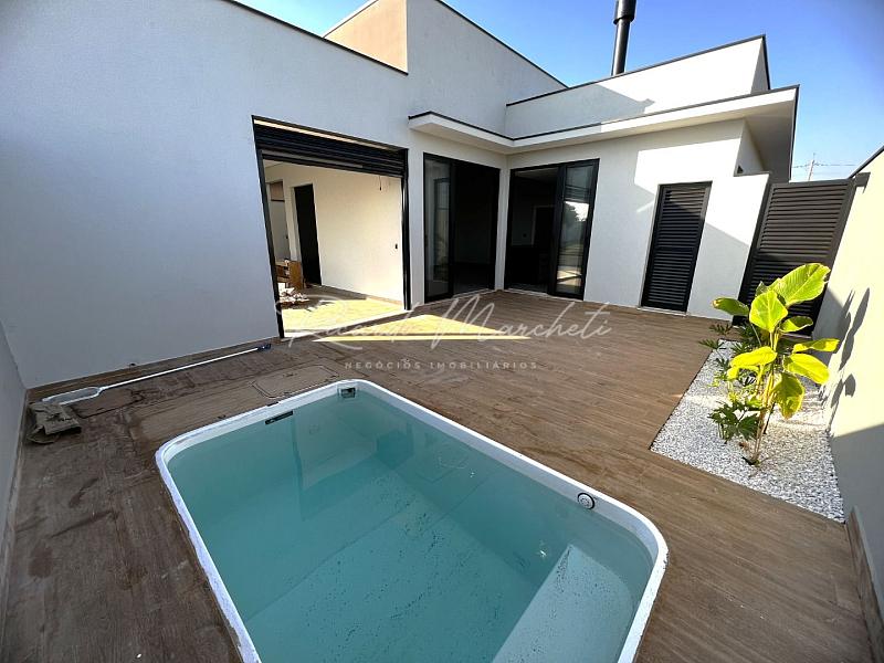 Casa térrea recem construida, projeto integrado com 3 suites 1 com closet, sala dois ambientes pé direito alto, escritório, lavanderia, quintal com piscina e banheiro apoio.