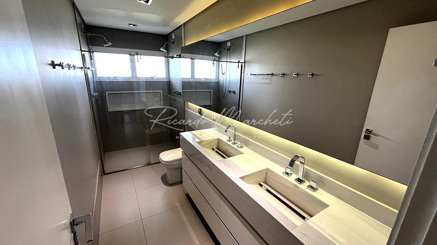 Nas quatro suítes, o conforto é absoluto. Três delas contam com varandas privativas e vista para o condomínio, enquanto a suíte master oferece uma experiência de hotel cinco estrelas: closet espaçoso, banheiro elegante e acabamentos que exalam exclusividade.