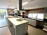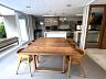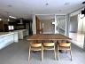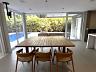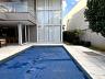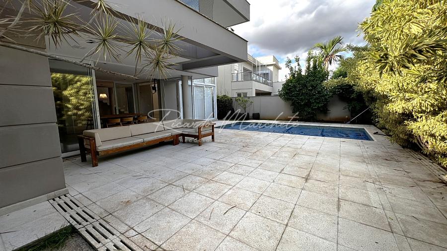 A sala de jantar se conecta de forma fluida à cozinha planejada, equipada com duas ilhas e acabamento de alto padrão — o espaço perfeito para receber amigos, preparar refeições especiais ou apenas apreciar um bom vinho ao fim do dia. O espaço gourmet convida a momentos de lazer, com churrasqueira, forno de pizza e uma vista privilegiada para o quintal arborizado e a piscina aquecida, onde o sol se reflete suavemente na água azul-turquesa.