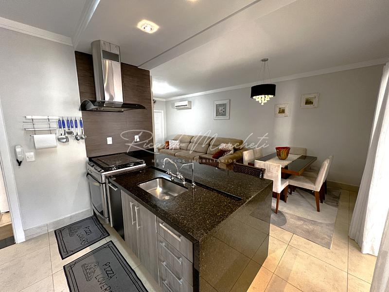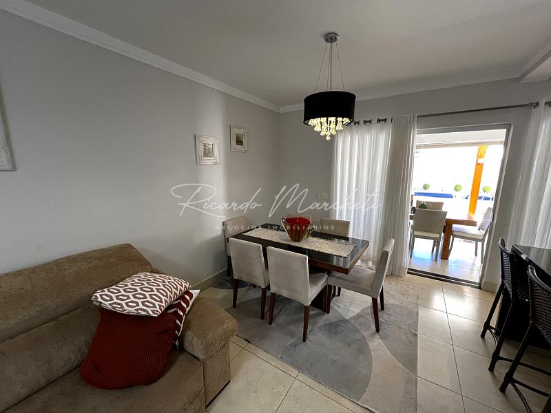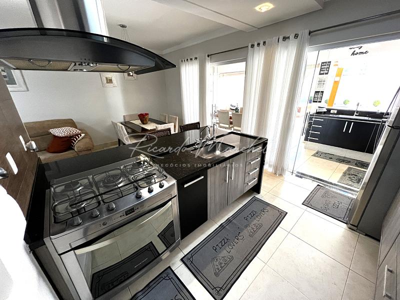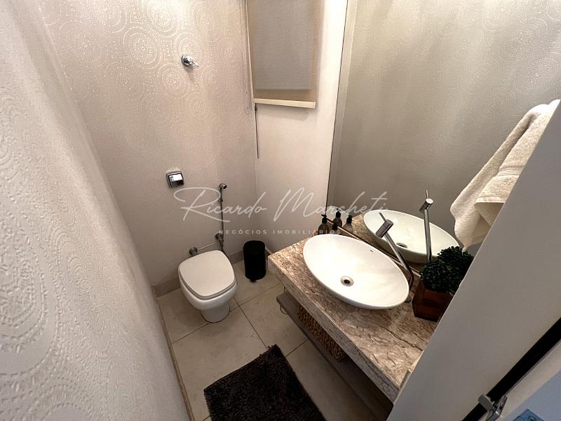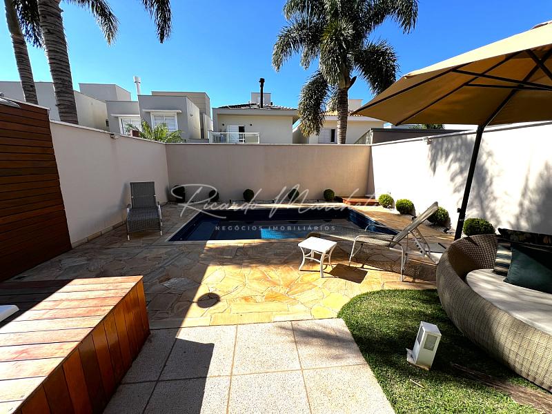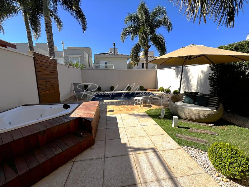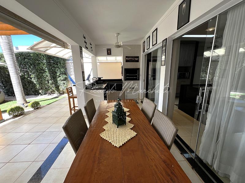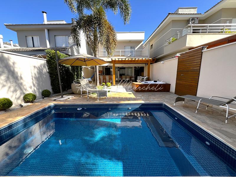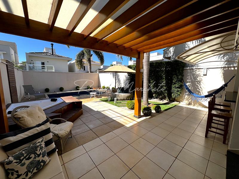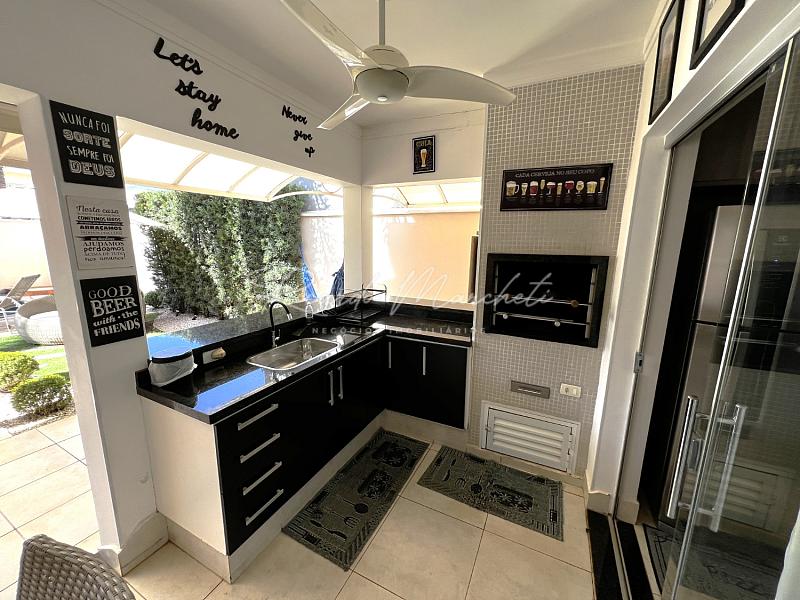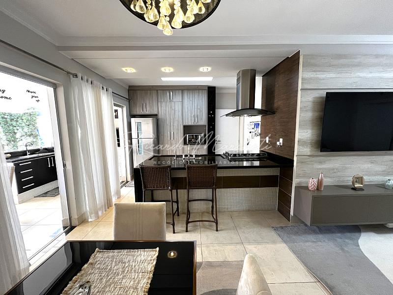 No pavimento térreo, lavabo, sala dois ambientes integrados a cozinha tipo americana toda planejada, lavanderia coberta e com armários, acesso independente pela garagem, saindo da sala de jantar acessamos a varanda com espaço gourmet, churrasqueira carvão, mesa com 6 cadeiras, sofa, spa, paisagismo, piscina com iluminação, garagem  para 2 veiculos.