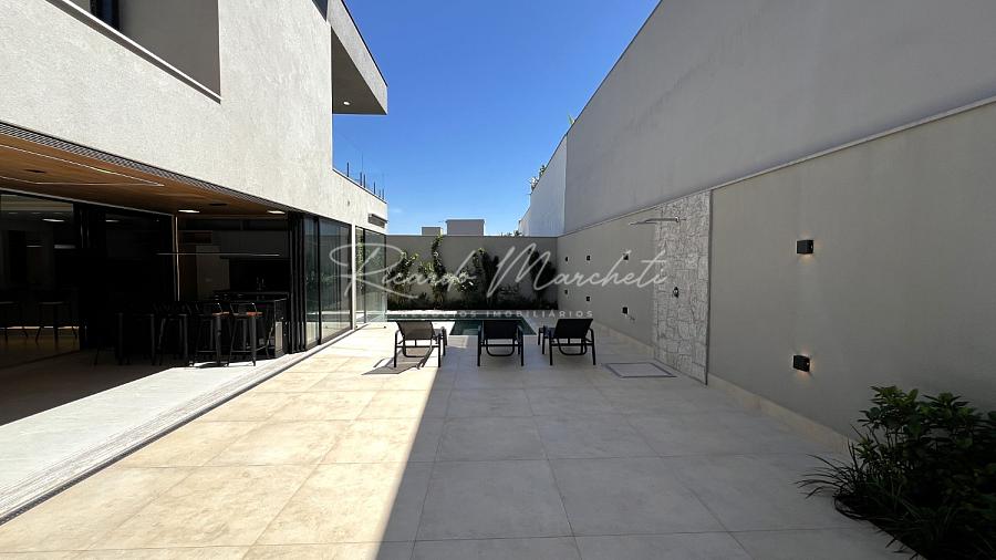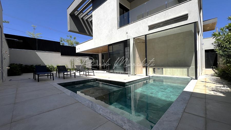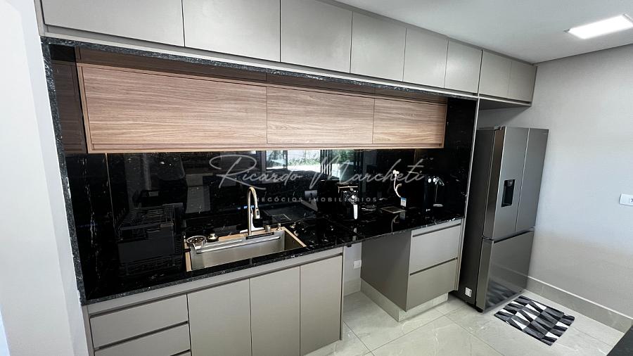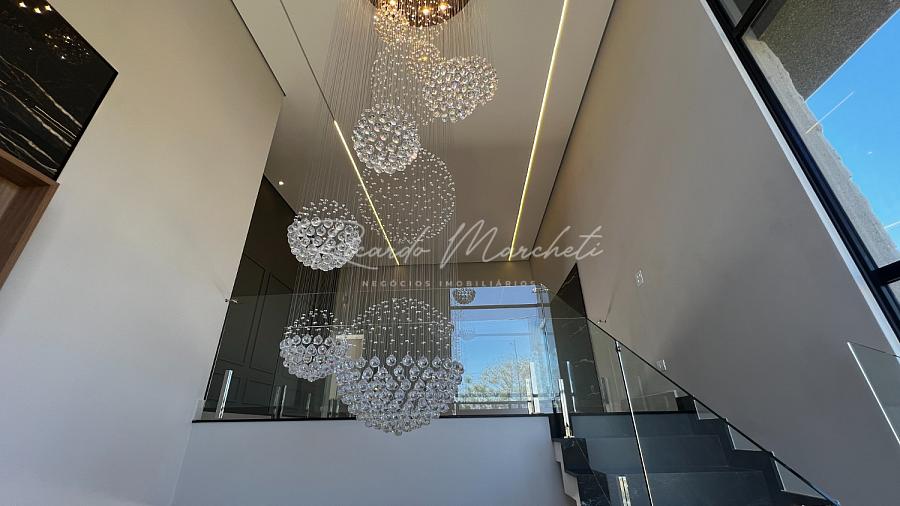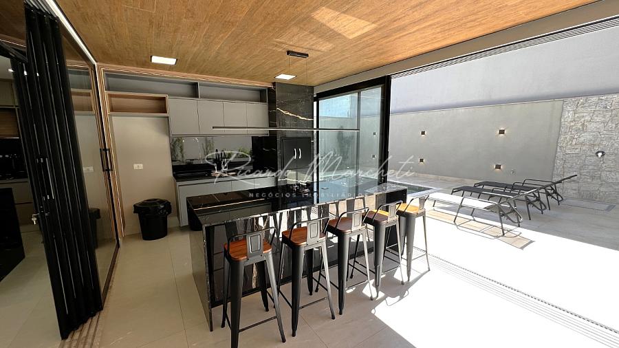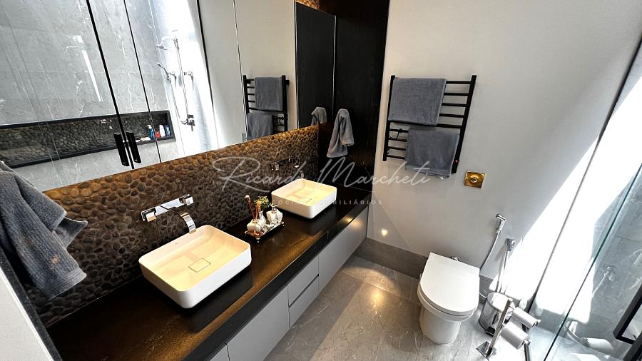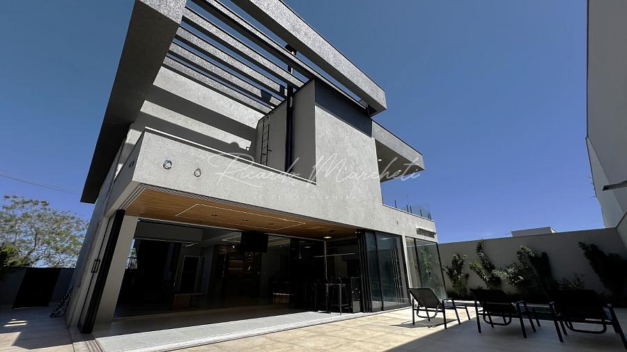 Ponto de carregamento na garagem para carro elétrico ou plugin, Irrigação automática em todo o paisagismo, Aquecimento da piscina por trocador de calor inverter TIV 25 Sodramar, casa de máquinas da piscina: com gerador de cloro easycolor G5-3 Nautilus, Água quente e fria em todas as torneiras, Água quente e água fria pressurizada em toda a casa,  Ducha da piscina com água fria e quente, Sistema de Microgeração Distribuída Fotovoltaica constituído por 16 (dezesseis) módulos solares de 570 Wp e 04 (quatro) microinversores de 2000W. Capacidade de gerar 8 kW,  Elétrica inteligente, Automação residencial, Controle da casa por app, Infra instalada para sistema de dados, Infra instalada para sistema de monitoramento, Toalheiros têrmicos em três banheiros, Tela mosqueteira em um banheiro e nos três quartos, Infra de ar condicionado nos três quartos, closet suíte master casal, escritório, sala, adega e área gourmet Volumetrias arquitetônicas em light steel frame, Teto vinílico na área gourmet e na sacada da suíte master casalVigas em balanço nos quatro cantos da casa, no piso inferior e no piso superior, Lavabo com pia esculpia em mármore branco paraná, Torre de tomadas na ilha gourmet, com 220 V, 127 V, USB e indução, Cooktops a gás nas duas ilhas, Coifa em aço inox 430 escovado e motor de 1400m3/h de vazão na ilha da cozinha, Triturador na pia da área gourmet e da cozinha, Pia da cozinha com dispenser de detergente e lava copos, Pia da área gourmet com dispenser de detergente, Despensa com espaço para freezer vertical, Porta dos armários da dispensa com vidro reflecta, Pisos e revestimentos: porcelanato 90x90, piso vinílico, teto vinílico, rodapé branco Santa Luzia e piscina com atol jade, Paisagismo: salvia mexicana, pleomele verde, alecrim rasteiro, veitcha mirrilli, podocarpus, barba de serpente verde, gardênia, sete copas africana e grama esmeralda., ármores utilizados: preto negresco, preto negresco escovado, branco paraná no lavabo, soleiras e peitoris em branco siena escovado, muros das laterais, depósito em ardósia cinza e borda da piscina branco com cinza 3 cm com acabamento bisotê lixado sextavado.
