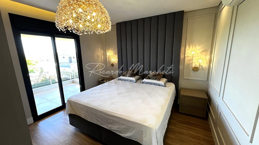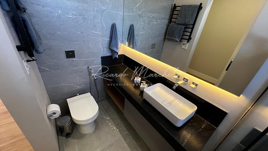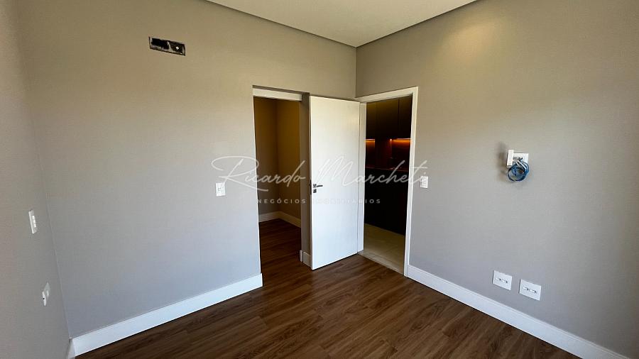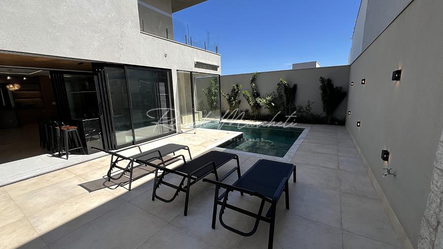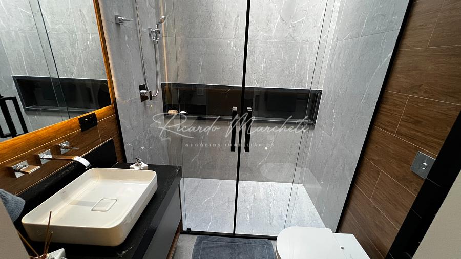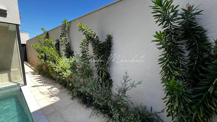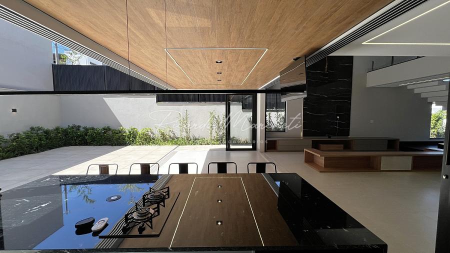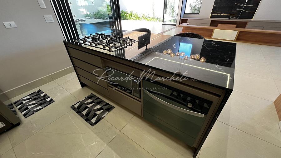 Ponto de carregamento na garagem para carro elétrico ou plugin, Irrigação automática em todo o paisagismo, Aquecimento da piscina por trocador de calor inverter TIV 25 Sodramar, casa de máquinas da piscina: com gerador de cloro easycolor G5-3 Nautilus, Água quente e fria em todas as torneiras, Água quente e água fria pressurizada em toda a casa,  Ducha da piscina com água fria e quente, Sistema de Microgeração Distribuída Fotovoltaica constituído por 16 (dezesseis) módulos solares de 570 Wp e 04 (quatro) microinversores de 2000W. Capacidade de gerar 8 kW,  Elétrica inteligente, Automação residencial, Controle da casa por app, Infra instalada para sistema de dados, Infra instalada para sistema de monitoramento, Toalheiros têrmicos em três banheiros, Tela mosqueteira em um banheiro e nos três quartos, Infra de ar condicionado nos três quartos, closet suíte master casal, escritório, sala, adega e área gourmet Volumetrias arquitetônicas em light steel frame, Teto vinílico na área gourmet e na sacada da suíte master casalVigas em balanço nos quatro cantos da casa, no piso inferior e no piso superior, Lavabo com pia esculpia em mármore branco paraná, Torre de tomadas na ilha gourmet, com 220 V, 127 V, USB e indução, Cooktops a gás nas duas ilhas, Coifa em aço inox 430 escovado e motor de 1400m3/h de vazão na ilha da cozinha, Triturador na pia da área gourmet e da cozinha, Pia da cozinha com dispenser de detergente e lava copos, Pia da área gourmet com dispenser de detergente, Despensa com espaço para freezer vertical, Porta dos armários da dispensa com vidro reflecta, Pisos e revestimentos: porcelanato 90x90, piso vinílico, teto vinílico, rodapé branco Santa Luzia e piscina com atol jade, Paisagismo: salvia mexicana, pleomele verde, alecrim rasteiro, veitcha mirrilli, podocarpus, barba de serpente verde, gardênia, sete copas africana e grama esmeralda., ármores utilizados: preto negresco, preto negresco escovado, branco paraná no lavabo, soleiras e peitoris em branco siena escovado, muros das laterais, depósito em ardósia cinza e borda da piscina branco com cinza 3 cm com acabamento bisotê lixado sextavado.