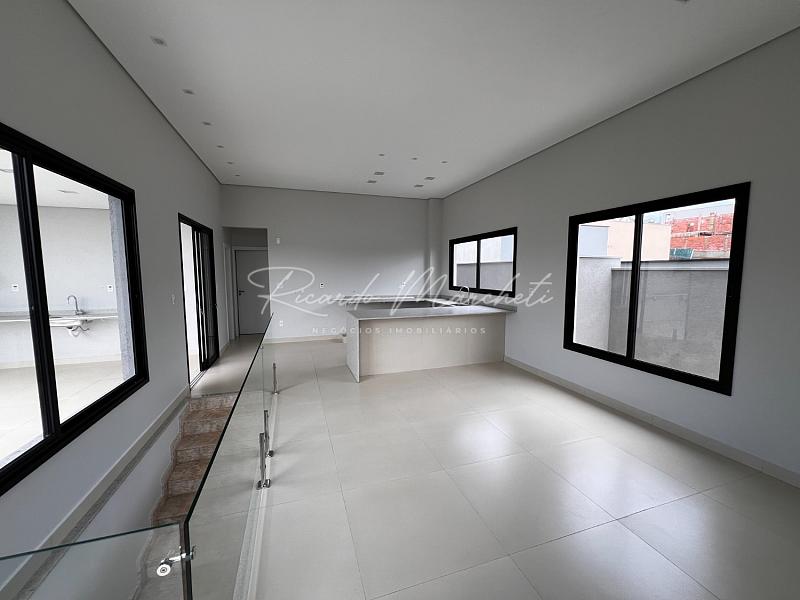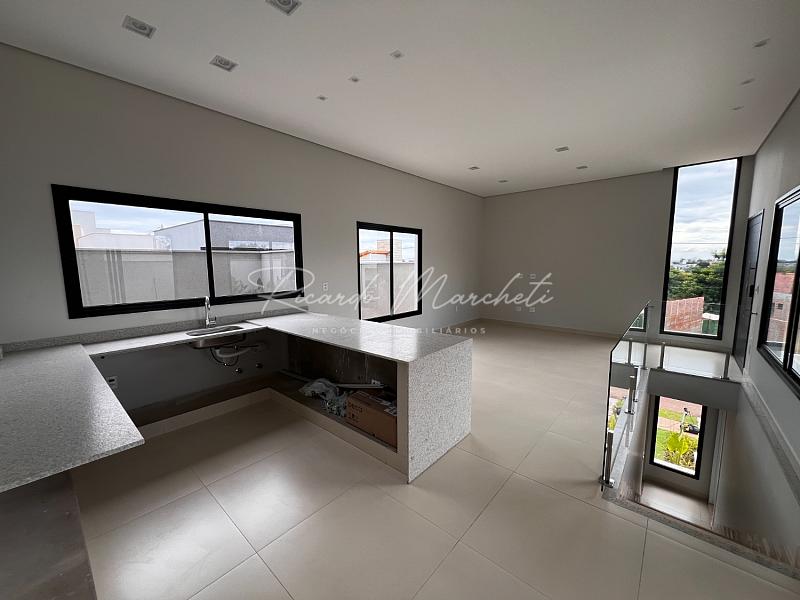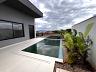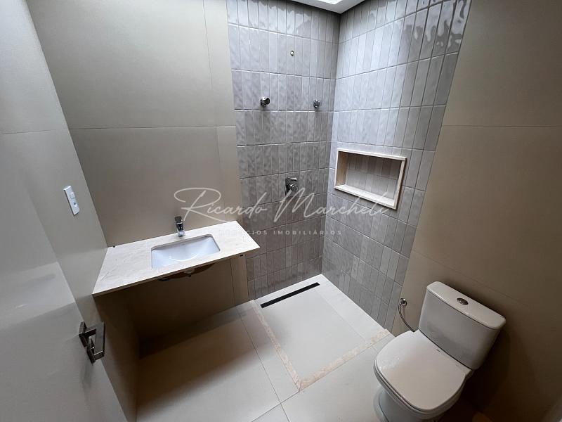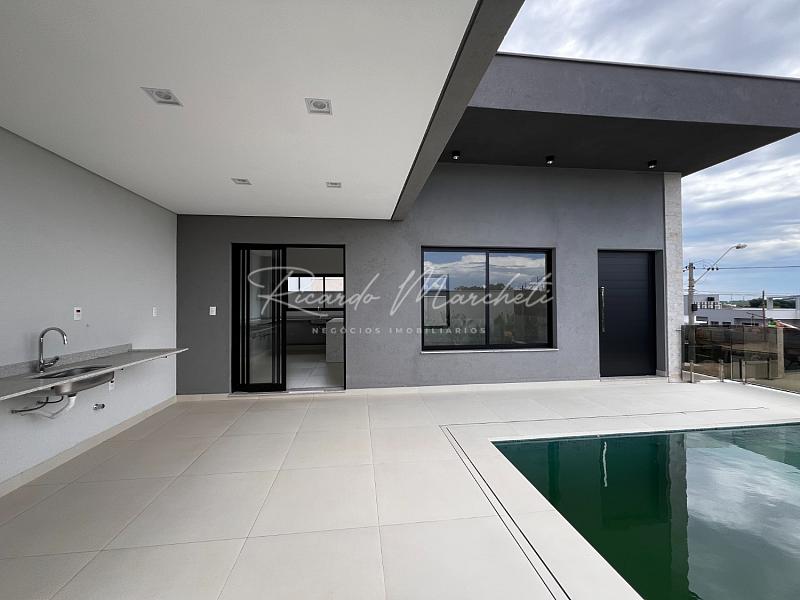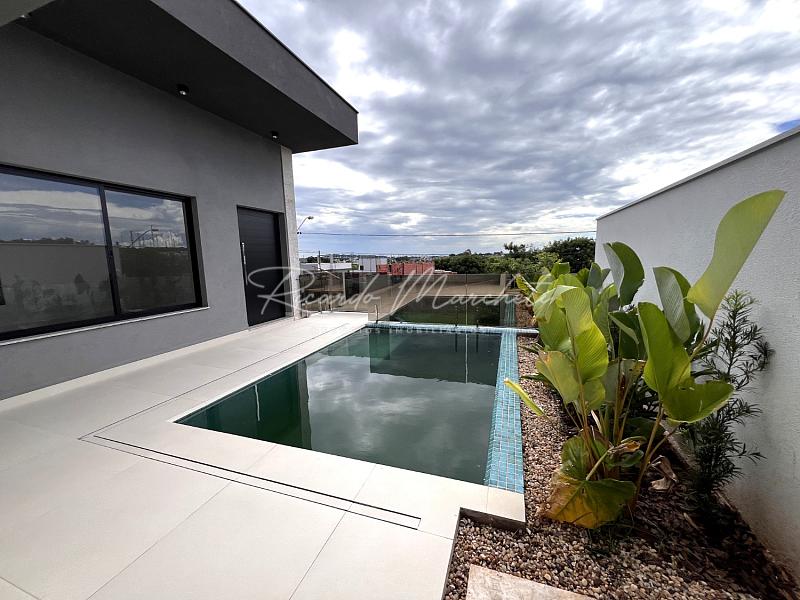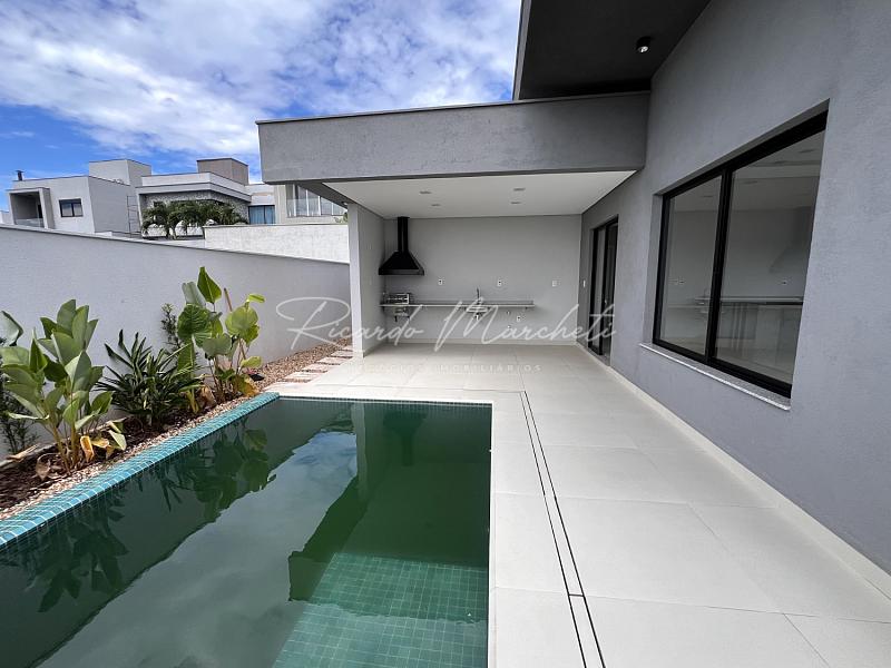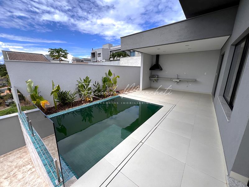 Casa semi térrea com fachada contemporanea nova distribuida em 3 Suites uma com closet, sala dois ambientes integrada a cozinha tipo americana com pia tipo peninsula, espaço gourmet, piscina, paisagismo, wc externo, garagem 4 carros sendo dois cobertos.