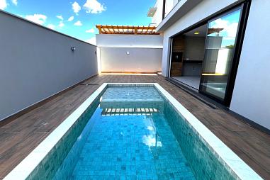 Piscina aquecida com prainha, lindo deck e pergolado em madeira executado pela Rústica, banheiro externo e lindo paisagismo e 4 vagas de garagem sendo 2 cobertos.