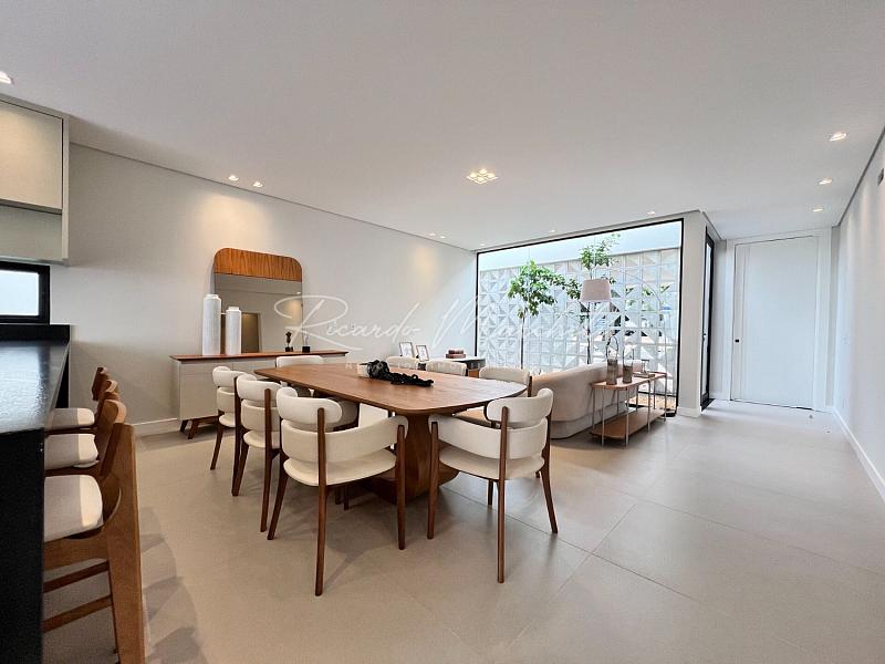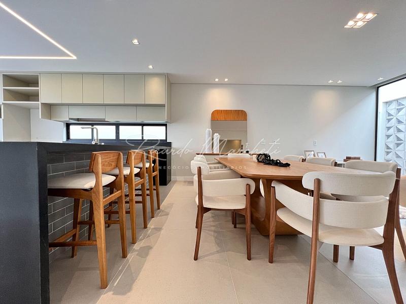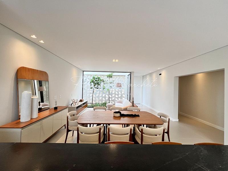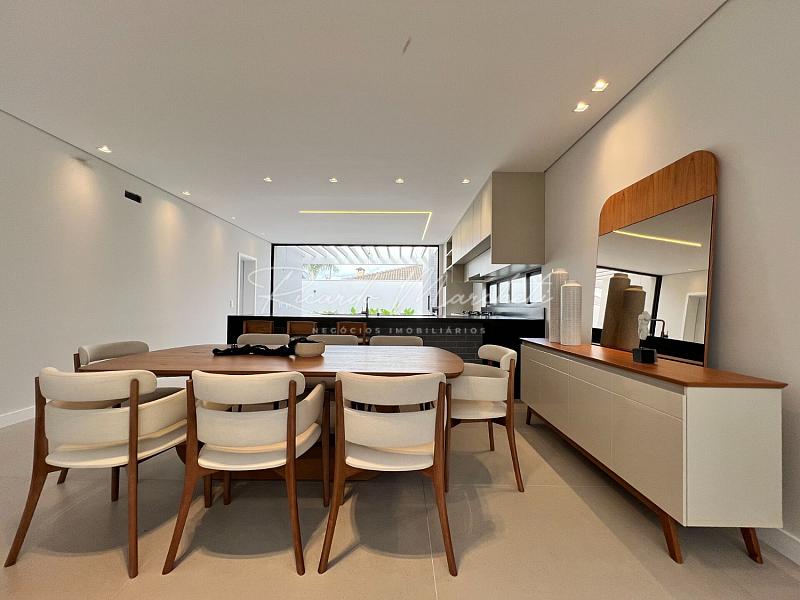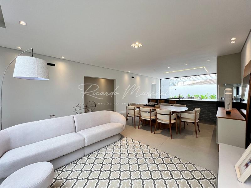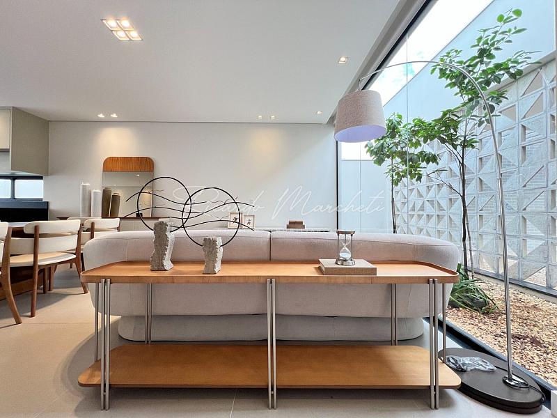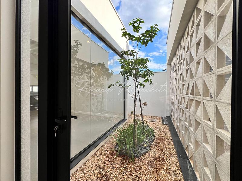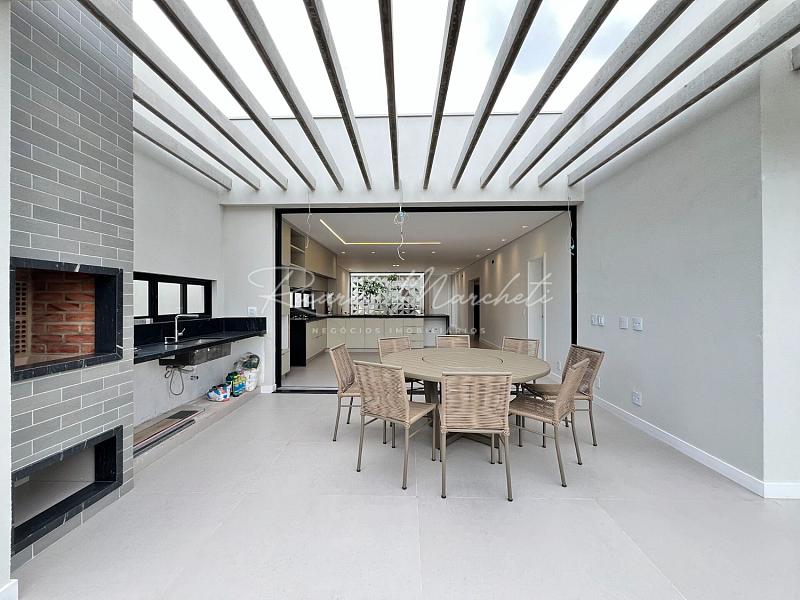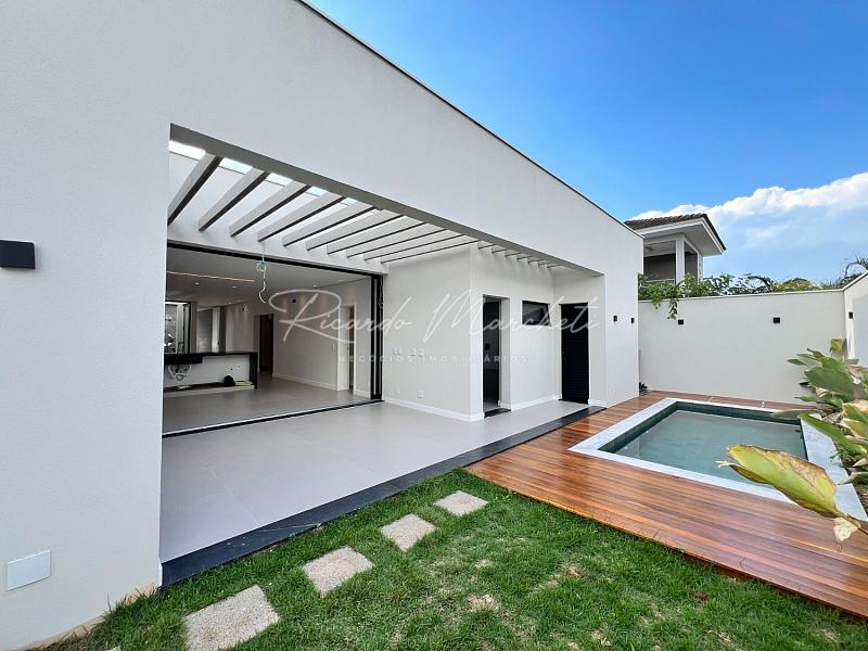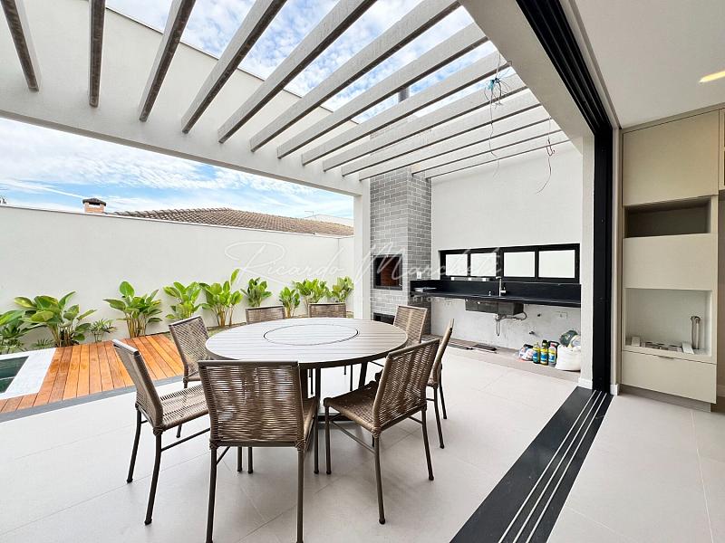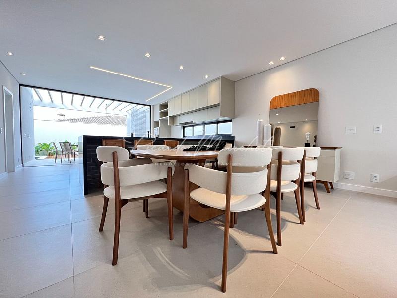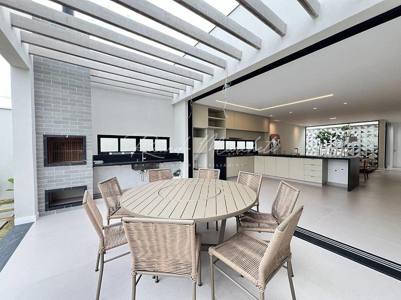 3 suítes espaço para closet pia e chuveiro duplo, sala integrada a cozinha tipo americana planejada, área gourmet, lavabo externo, lavanderia, piscina de alvenaria com deck de madeira, e piscina, 2 acessos laterais, sendo um para área de serviço e outro para o espaço piscina, jardim com fechamento em esquadria e cobogó, garagem coberta para 2 carros e 2 descobertas.