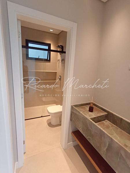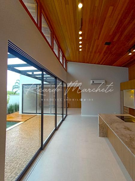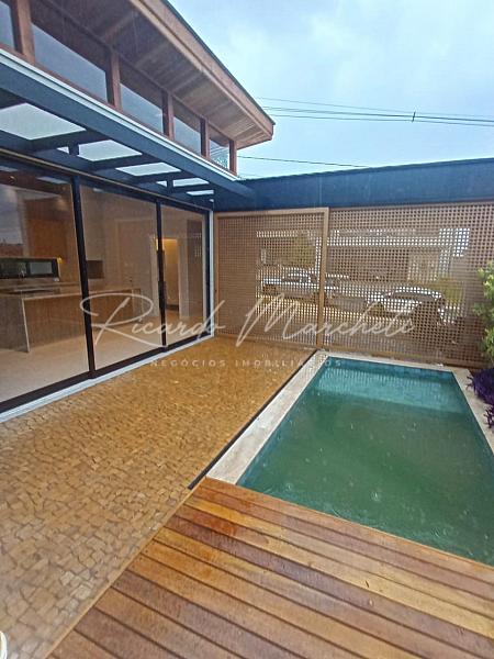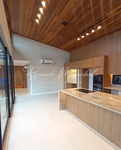 Casa térrea com projeto integrado, fachada contemporanea, com alto padrão em acabamento distribuidos em 3 suites sendo 1 master todas com espaço closet e climatizadas, suite master com bancada em pia dupla em quartzito Taj Mahal, lavabo com quatzito verde J'adore, escritório, sala com painel em madeira, cozinha planejada com corrediças invisiveis , amortecedor e cristaleira com vidro reflecta, ilha em quartzito Taj Mahal com fogão de indução e coifa integrada eletrolux, torre quente com forno elétrico e microondas embutidos eletrolux, lavanderia com armários planejados, piscina aquecida, garagem 4 carros sendo 2 cobertos, paisagismo formado e completo.