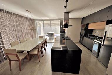 A casa tem um acabamento refinado em uma mistura de moderno com o rustico, salas com pé direito duplo, destaque para os ambientes revestidos em madeira proporcionando aconchego e sofisticação.